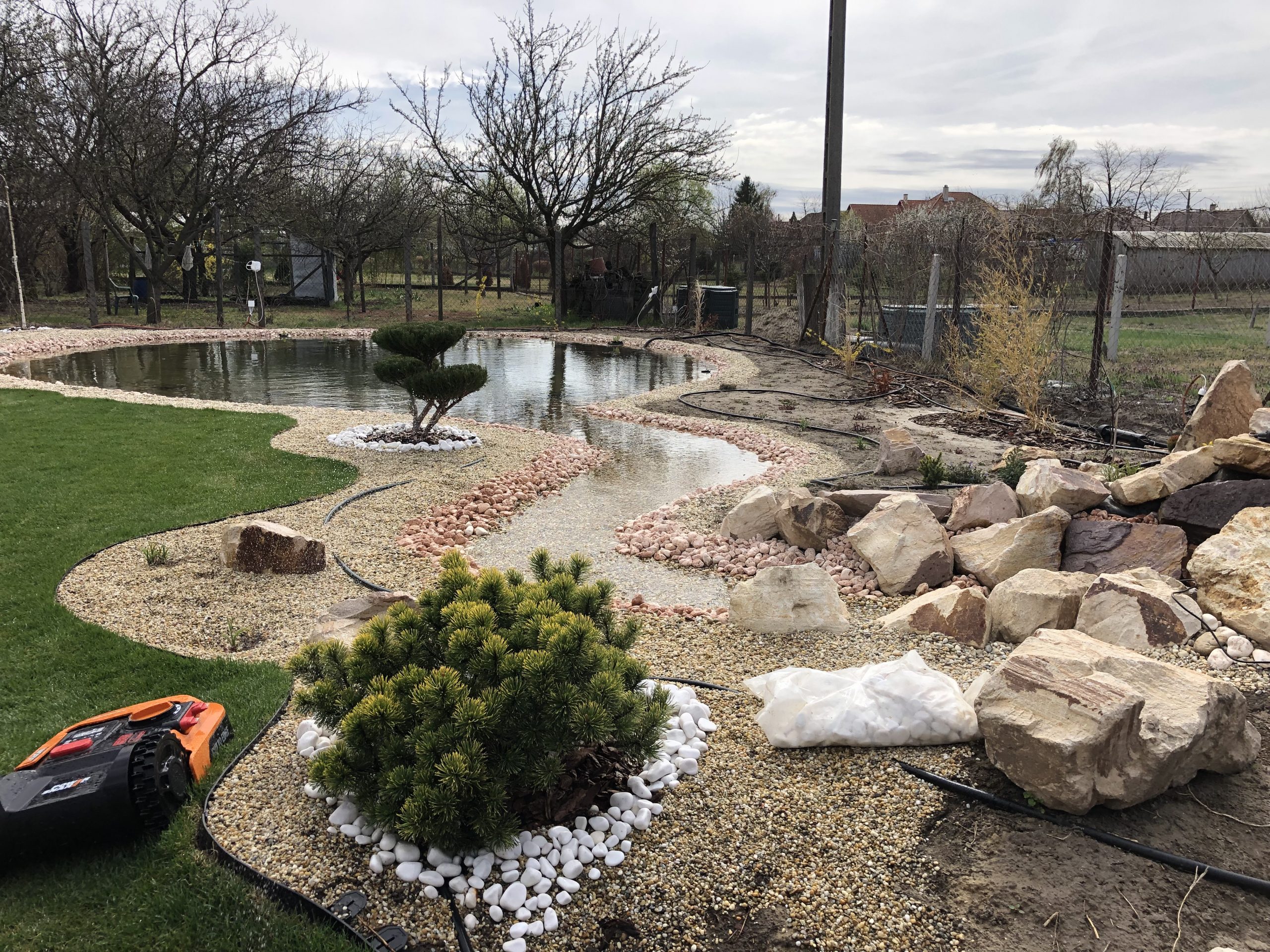 Helyszíni felmérés után megtervezzük és A-tól Z-ig kivitelezzük álmai vízarchitektúráját. A földmunkával, ásással kezdünk, majd a meder kialakítását követően (nagyobb vagy különleges formájú tavak esetén szakszerű tófólia hegesztő partnerünk közreműködésével) fóliázzuk. Ez után folyami kavicsokkal,sziklákkal, vízinövényekkel, felszíni növényzettel takarjuk el a fóliát. Beépítésre kerül továbbá a víz szűrőberendezése, ami függ a tó méretétől, jellegétől (fürdőtó vagy dísztó), illetve csobogó kialakítása, ez utóbbi opcionális.